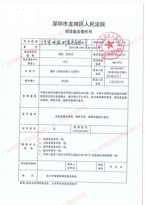 受深圳市龍崗區人民法院的《司法鑒定委托書》,保順檢測鑒定公司對該委托事由進行檢查、鑒定。本次鑒定的主要工作內容如下: