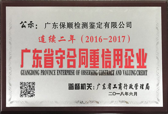 2018年6月,廣東保順檢測鑒定有限公司連續第二年獲評“廣東省守合同重信用企業”。