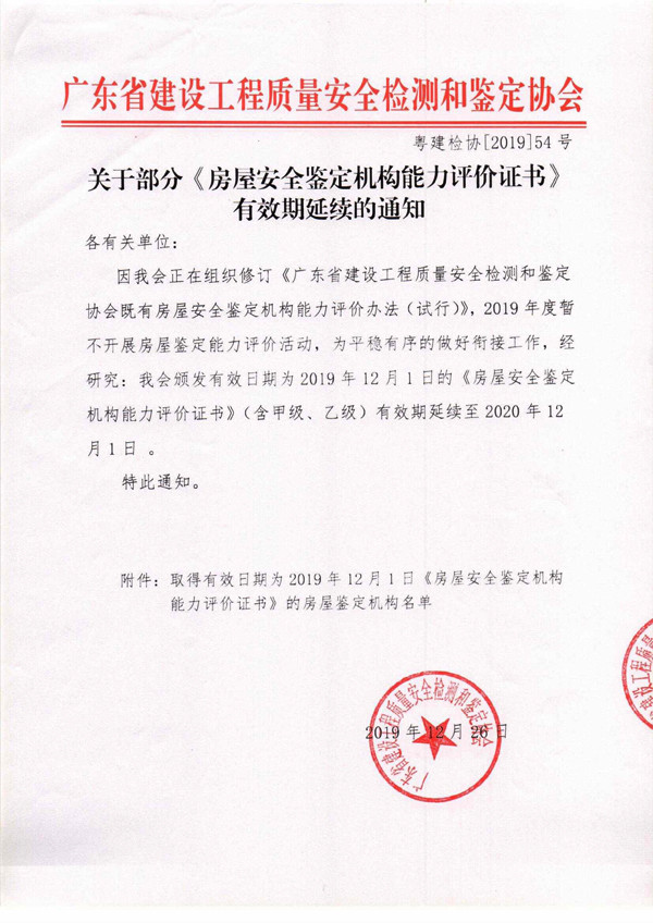 因我會正在組織修訂《廣東省建設工程質量安全檢測和鑒定協會既有房屋安全鑒定機構能力評價辦法(試行)》,2019年度暫不開展房屋鑒定能力評價活動,為平穩有序的做好銜接工作,經研究:我會頒發有效日期為2019年12月1日的《房屋安全鑒定機構能力評價證書》(含甲級、乙級)有效期延續至2020年12月1日。