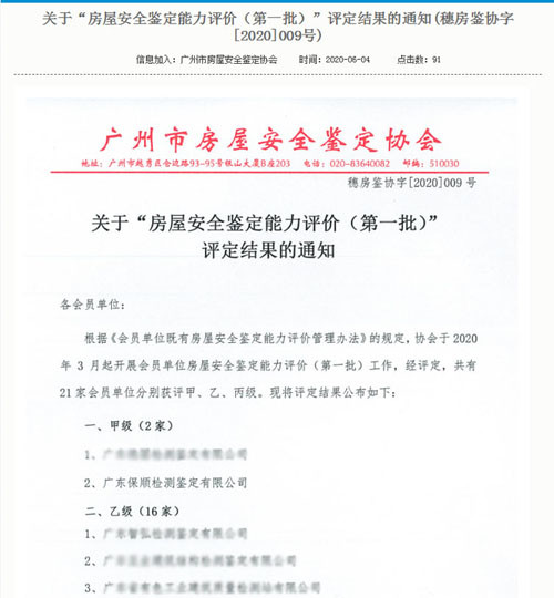 2020年6月4日,廣州市房屋安全鑒定協(xié)會在官方網(wǎng)站上發(fā)布了《關(guān)于“房屋安全鑒定能力評價(jià)(第一批)”評定結(jié)果的通知(穗房鑒協(xié)字[2020]009號)》,公布了本次分別獲評甲、乙、丙級的單位,共有21家獲評,其中獲評甲級的僅有兩家,保順為其中一家。