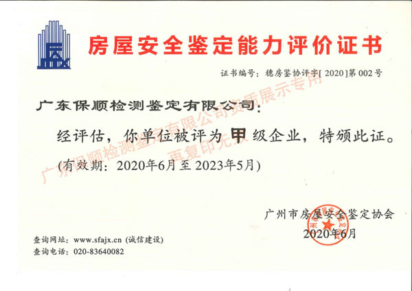 廣東保順檢測鑒定有限公司于2016年被廣東省建設(shè)工程質(zhì)量安全檢測鑒定協(xié)會評為房屋安全鑒定能力甲級企業(yè),本次評定為繼廣東省建設(shè)工程質(zhì)量安全檢測鑒定協(xié)會后被廣州市房屋安全鑒定協(xié)會評為房屋安全鑒定能力甲級企業(yè)。